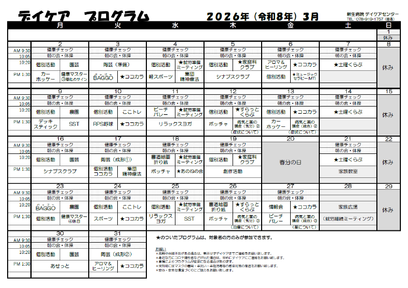 | 開所日時 | 平日(月~金) 9:30~15:30 毎月第2土曜 9:30~12:30 |