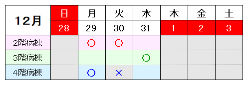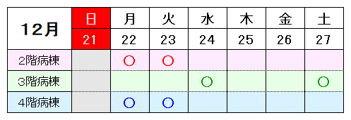 病棟ごとに面会対応が可能な曜日が異なりますが、それぞれの週ごとに申し込み期日を設けさせていただいておりますのでくれぐれもご注意ください。