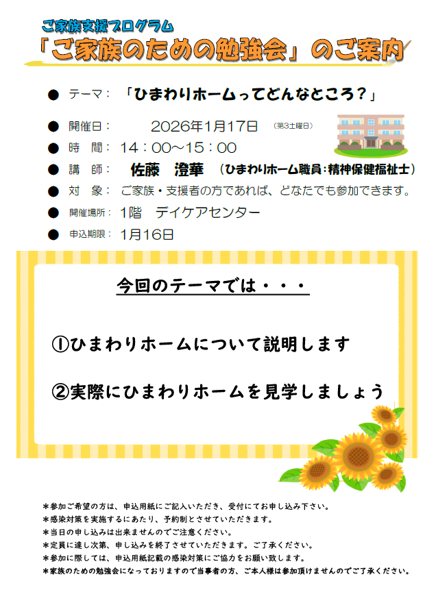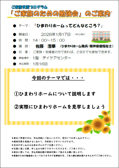 基本的な病気や薬、社会資源、ご本人様への回復をサポートするための関わり方などを勉強して頂き、ご家族様の負担を和らげると共に患者様へのより良い援助と回復に繋げていく機会として、開催しております。