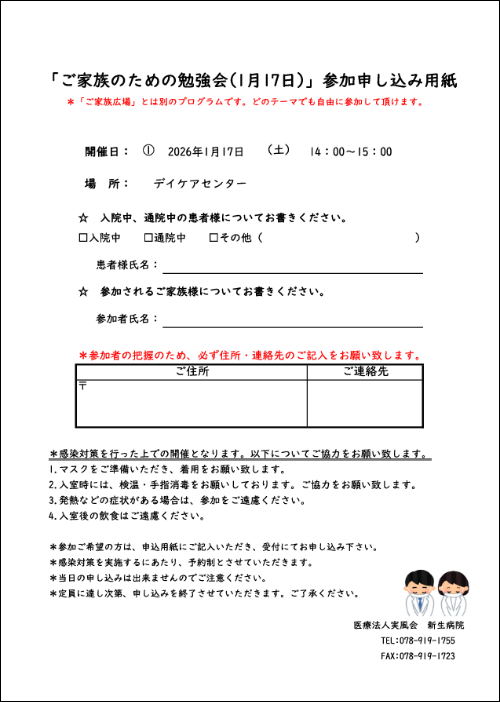 ご家族支援プログラムにご参加いただくにあたり当院の申込用紙をご用意しておりますので、参加ご希望の方は申込用紙をご提出下さい。