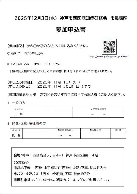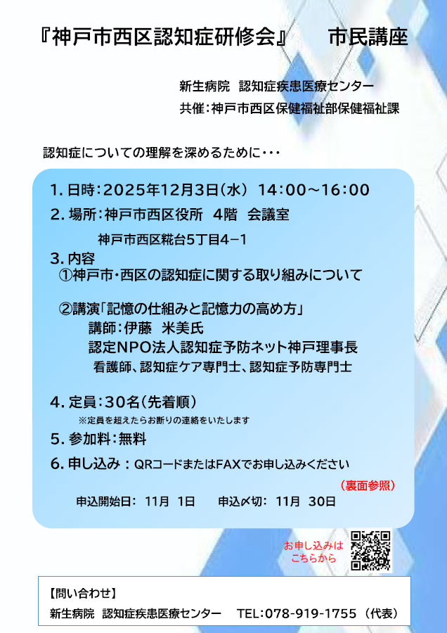 ※申し込み受付は新生病院の認知症疾患医療センターになります。西区役所の窓口では受付しておりませんのでご了承ください。