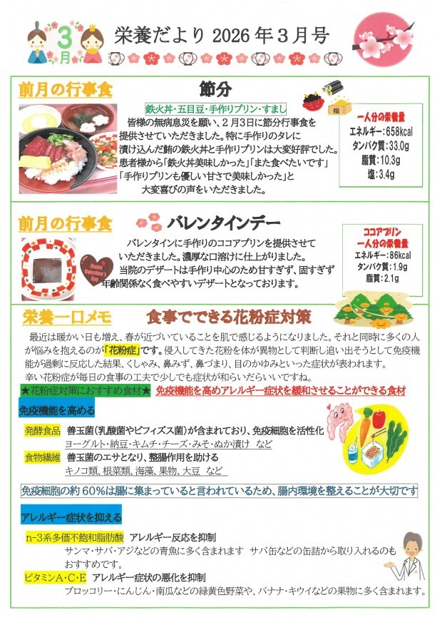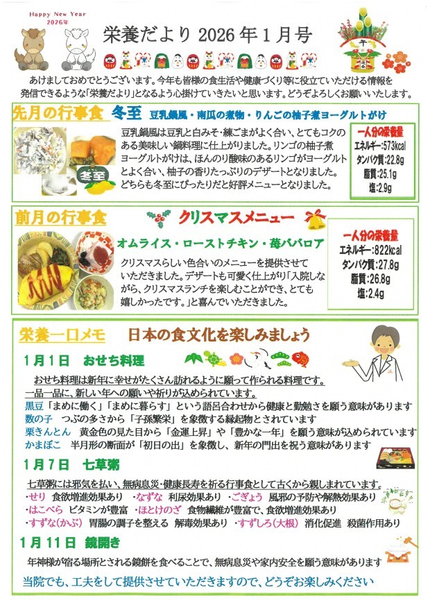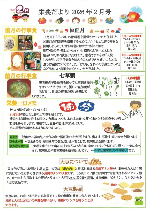 一般的な献立表は文字だけの献立が掲示されているところが多いかと思います。文字だけより写真でイメージし食欲を増して頂けるように献立だよりに、特に楽しみにして頂きたい献立のイメージ写真を入れています。栄養ひとくちメモも掲載し各階の掲示場所と面会室に貼っていますのでぜひご覧下さい。 |